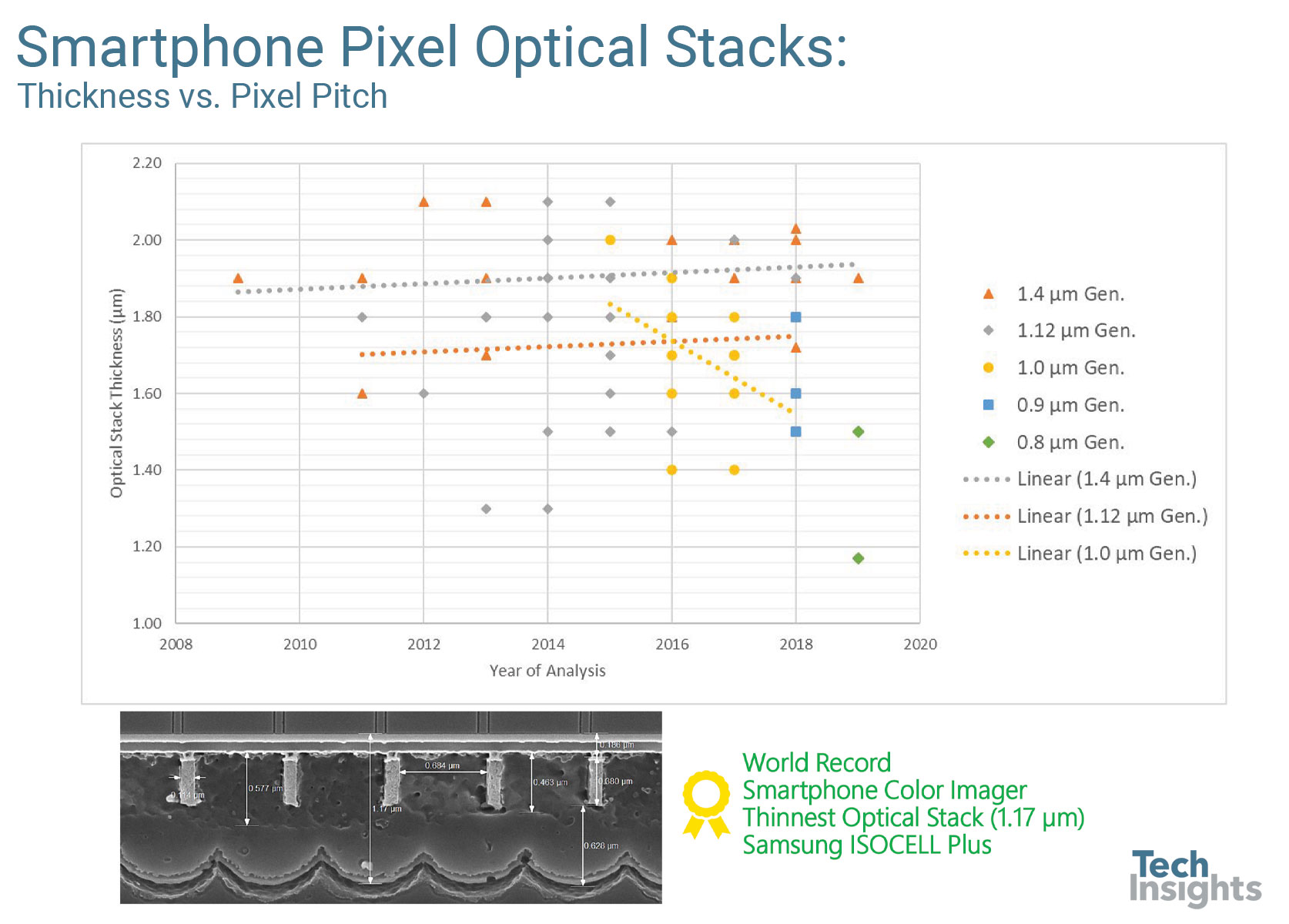 分配给IISW演讲的时间不允许讨论光学堆栈趋势,而且这个主题不适合于文本+图形的讨论。也就是说,图1示出了0.8µm生成像素所需的光学堆栈细化。据我们所知,三星在其ISOCELL Plus技术平台上实现了1.17µm的超薄光学堆栈,创下了世界纪录。